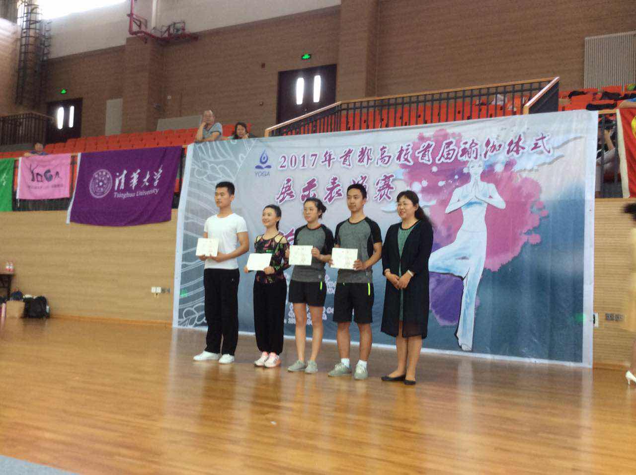 各校运动员身着瑜伽表演服,或是裙裾飘飘,或是青春健美,伴随着宁静优雅的瑜伽背景乐,组合变换着一个又一个赏心悦目的瑜伽体式: 伸展、拧 转、力量、平衡。整个赛场洋溢着轻松愉悦的气息。 beat365由体育部的王娟老师和蔡晓竹老师带队参加了本次比赛的四个项目