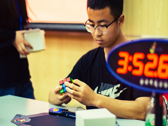 大赛于九点半正式开始,首先进行的是三阶单手的比赛项目,选手们按照流程检录并按顺序依次参加比赛,选手们出色的表现使得比赛竞争十分火热。依次进行的是二阶速拧和三阶速拧的预赛,两个项目可谓是大佬云集,是大赛的聚焦点,选手们为争夺下午决赛的入场卷使尽浑身解数,抽奖互动活动,主办方发放枫叶魔方,并为热心观赛同学们热心讲解魔方基础知识,让观赛同学们亲自参与、感受魔方魅力。