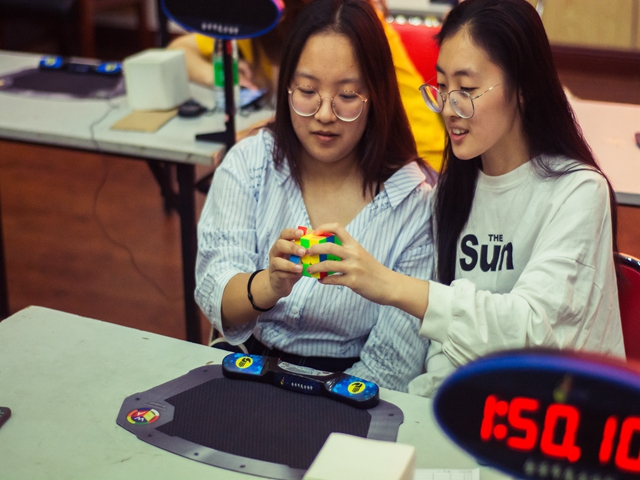 下午赛事正常推进,首先是双人合拧和双人盲拧的比赛,双人合作十分考验默契,对相互间的技术配合提出更高要求。团体接力项目,各个团队凭借出色的表现为各自的书院、学院荣誉而战。下面到了激动人心的时刻,迎来了二阶、三阶魔方比赛的决赛,三阶魔方决赛采用车轮战,每场淘汰一名选手,直到产生最后的冠军,紧张的赛制带给选手很大的压力,选手们沉着冷静、化压力为动力,调整心态积极应战,勇于竞争、超越自我,拿出绝佳技术为冠军而战,最终信息与电子学院获得团体总分冠军,为期一天的魔方大赛顺利落幕。