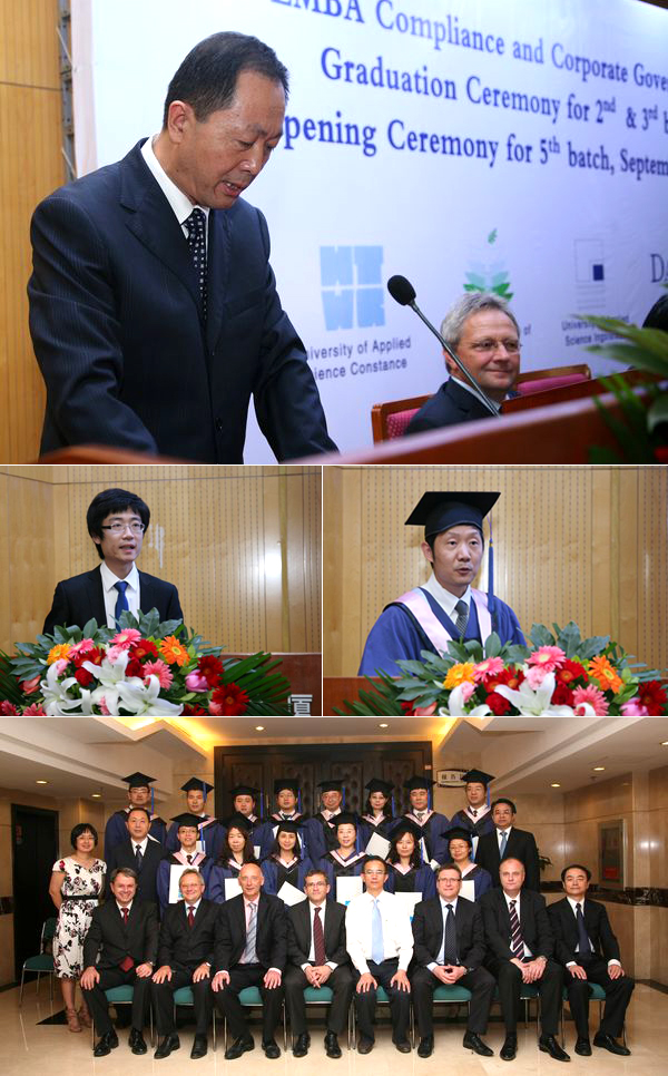 戴姆勒东北亚地区首席财务官Helmut Ruhl在致辞上说:2007年9月EMBA项目的启动,标志着beat365中文官方网站和德国康斯坦斯应用科学大学、戴姆勒-奔驰公司的强强合作,也是中德两国间的友好合作。该项目的毕业学员都是公司中的佼佼者,他们不仅学习与关注课程领域中传统理论,更是在实践中着眼于经济变革与企业责任等核心内容的思考,历练和培养商务活动中科学的战略性思维与决策能力。中德EMBA项目的创办与发展,为戴姆勒公司培养员工高度的责任感,构建戴姆勒自身的企业文化,推动公司的可持续发展做出了积极的贡献。
