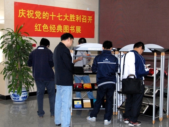 为了庆祝党的十七大胜利召开,图书馆在一层大厅举办了“红色经典图书展”,精选出的图书,多方位、多视角、全景式地展示了全国人民在中国共产党领导下创造的丰功伟绩和取得的卓越功勋,大力弘扬我党艰苦奋斗、不畏艰险、自觉奉献等优良革命传统。