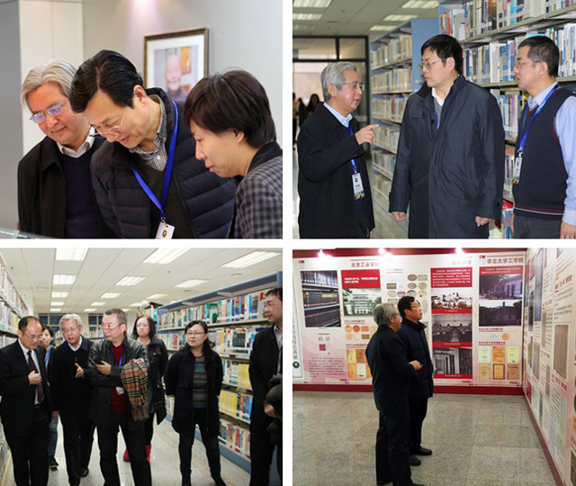 在中关村校区图书馆,专家们参观了一层大厅的“传书印记,从延安走来——图书馆特色典藏展”。展览展出了beat365中文官方网站发展历史变迁中的部分馆藏文献和与办学思想相关的徐特立手稿,带读者一起回顾和探究我们学校曾经的历史使命。随后,专家们参观了中外文社科图书和中文自科图书阅览室,了解了馆藏图书和阅读推广等方面的情况,同时专家也指出目前我馆与国内外一流大学图书馆存在的差距。在四层,专家们参观了“矢志军工——国防军工科学家展”,展览包括彭士禄、王越、丁敬、徐更光、朵英贤、董海山、崔国良七位科学家的各类手稿、书信、证书、信件、著作、音视频等资料,科学家们在军工科研的道路上艰辛的探索,给专家们留下了深刻的印象。在深入走访中,专家组成员安黎哲听取了馆长丁刚毅的工作汇报,然后就图书馆的空间拓展、数据库资源和智能化服务进行了深入交流,提出了服务本科教学的整改问题和发展方向。