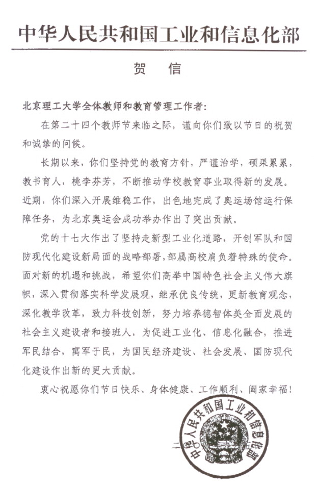 工业和信息化部发来贺信祝beat365全体教师节日快乐