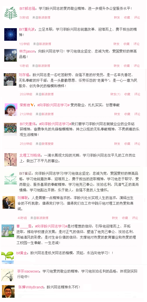 日前,学校办公室党支部积极响应学校和机关党委号召,在支部范围内深入开展向李盼兴同志学习活动。学校办公室主任郝志强指出,要将学习李盼兴同志活动作为学校办公室党支部建设的重要内容,把学习活动与本职工作相结合,爱岗敬业,甘于奉献,不断增强服务师生意识,不断提高服务质量,为学校更好更快发展做出新的更大的贡献。学校办公室党员同志们认真学习了学校党委的决定和李盼兴同志的先进事迹,纷纷通过网络微博表达感想。同志们表示,要结合自身岗位向李盼兴同志学习,学习他信念坚定,忠诚为党,爱国爱校的崇高品格,学习他锐意改革、迎难而上、勇于担当的进取精神,学习他忠于职守、爱岗敬业、服务基层的奉献精神,学习他克己奉公,淡泊名利,风清气正的高尚情操,学习他豁达开朗,乐于助人,自强不息的人生情怀。