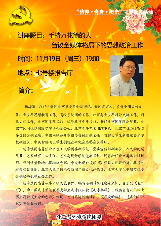 为切实引导和帮助青年学生以习近平总书记系列重要讲话精神为根本遵循,自觉将社会主义核心价值观内化于心、外化于行;鼓励学生做有理想、有道德、有文化的社会主义公民。此次讲座化工与环境学院团委有幸邀请到共青团北京市委副书记杨海滨老师为同学们做关于解读社会主义核心价值观的主题教育讲座,欢迎广大老师、青年同学聆听。