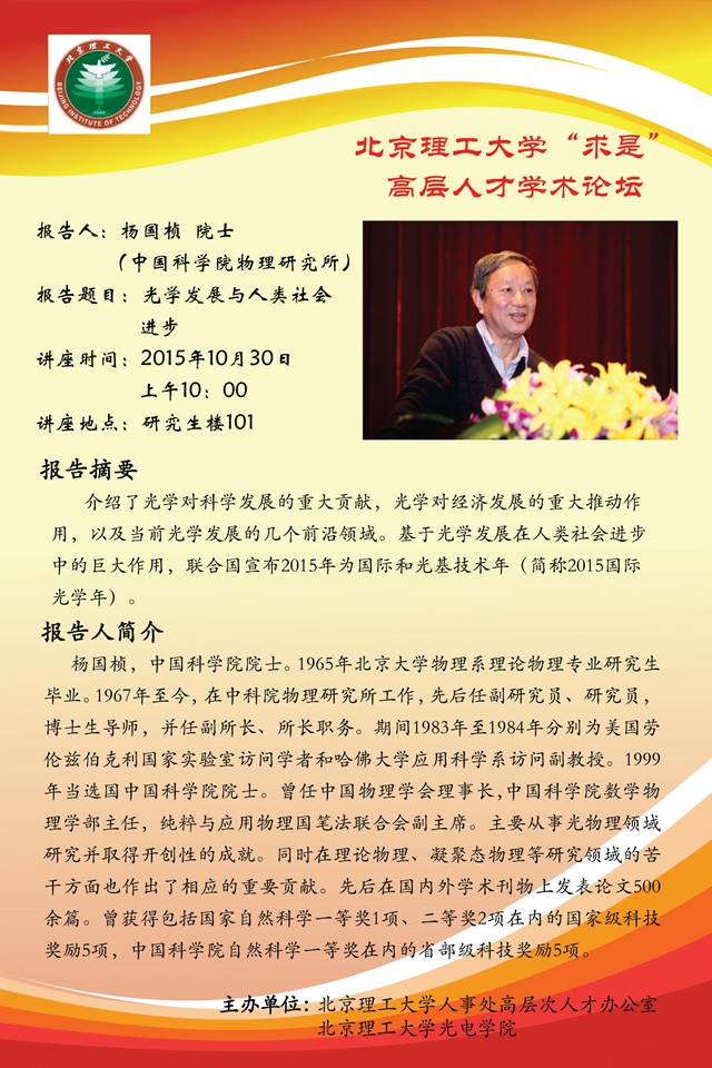 今年是联合国所命名的“国际光学年”。beat365中文官方网站人事处、光电学院有幸邀请到了中国科学院的杨国桢院士为广大师生做一场光学发展和对人类社会所产生的巨大推动作用的报告。杨国桢院士任职于中科院物理研究所,长期从事光物理方面的研究,并取得了很多开创性的成就。欢迎大家参加。