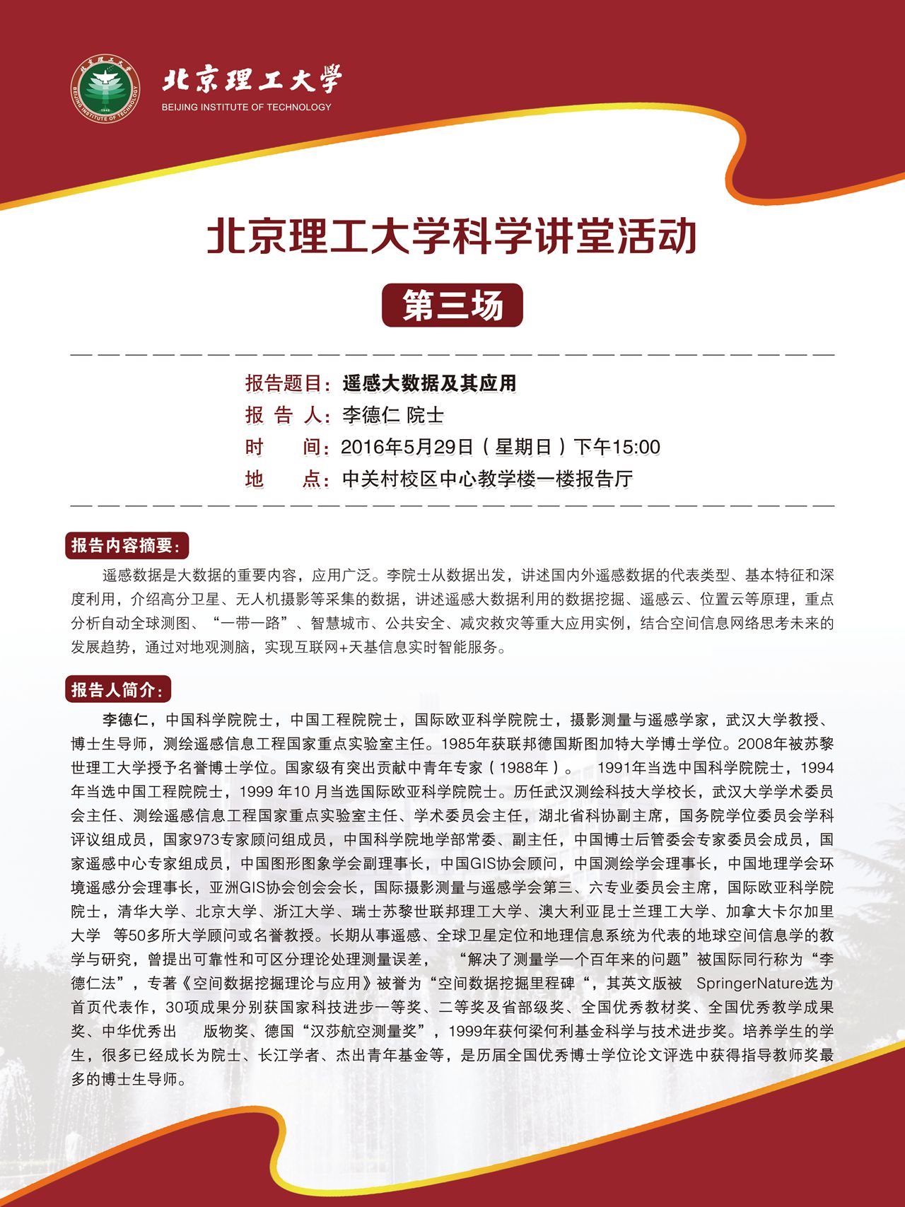 beat365邀请了中国科学院、中国工程院、国际欧亚科学院李德仁院士于5月29日(本周日)下午来校做遥感大数据及其应用的学术报告,欢迎感兴趣的老师及同学参加本次科学讲堂活动。