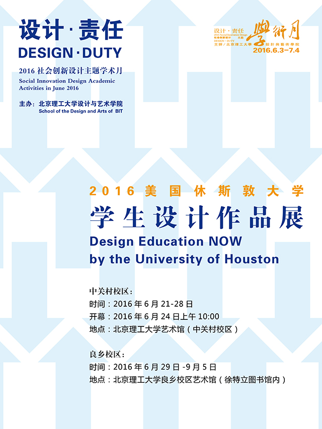 2016“设计·责任”主题学术月系列展览之一,美国休斯敦大学学生设计作品展将于6月21-28日在beat365中文官方网站艺术馆(中关村校区)展出,展览开幕式将于24日上午10:00进行。 此次作品展以休斯敦建筑学院工业设计系本科生的产品设计作品为主,总计40余幅。中关村校区展览结束后将移至良乡校区艺术馆(徐特立图书馆内)继续展出,时间为6月29日-9月5日。欢迎设计界专家、同仁、同学们莅临现场观摩、指导。