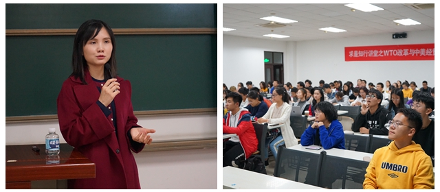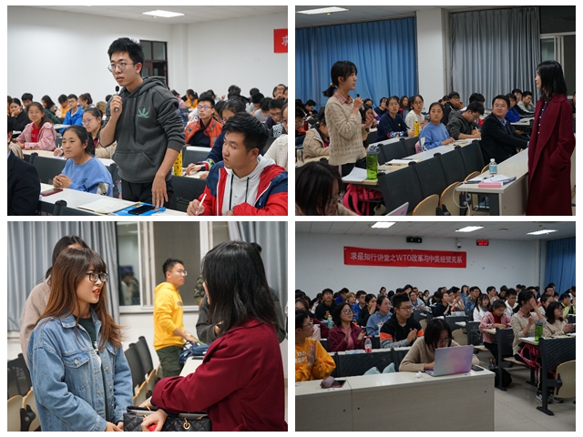 李教授将“WTO改革与中美经贸关系”通过三个部分重点宣讲,分别为“WTO的产生与发展”、“当前面临的危机”以及“中美经贸关系”。首先,李教授向同学们全面介绍了WTO多边贸易体制的发展过程,着重讲述了中国加入WTO的曲折历程,详细介绍了WTO的主要职能。其次,李教授深入分析了当前WTO多边贸易体制面临的危机,并分析了其中的两个主要原因——一是由WTO深层次的制度性问题以及各成员国利益分化导致的谈判效率低下,二是由美国角色和定位发生根本性变化导致的争端解决机制面临困境。最后,李教授以当前WTO改革进程中的中美经贸关系为出发点,向同学们阐释了面对中美贸易摩擦我国立场、应对策略,充分体现大气度和大担当,并深入分析了摩擦对WTO多边贸易体制和经济全球化的影响。