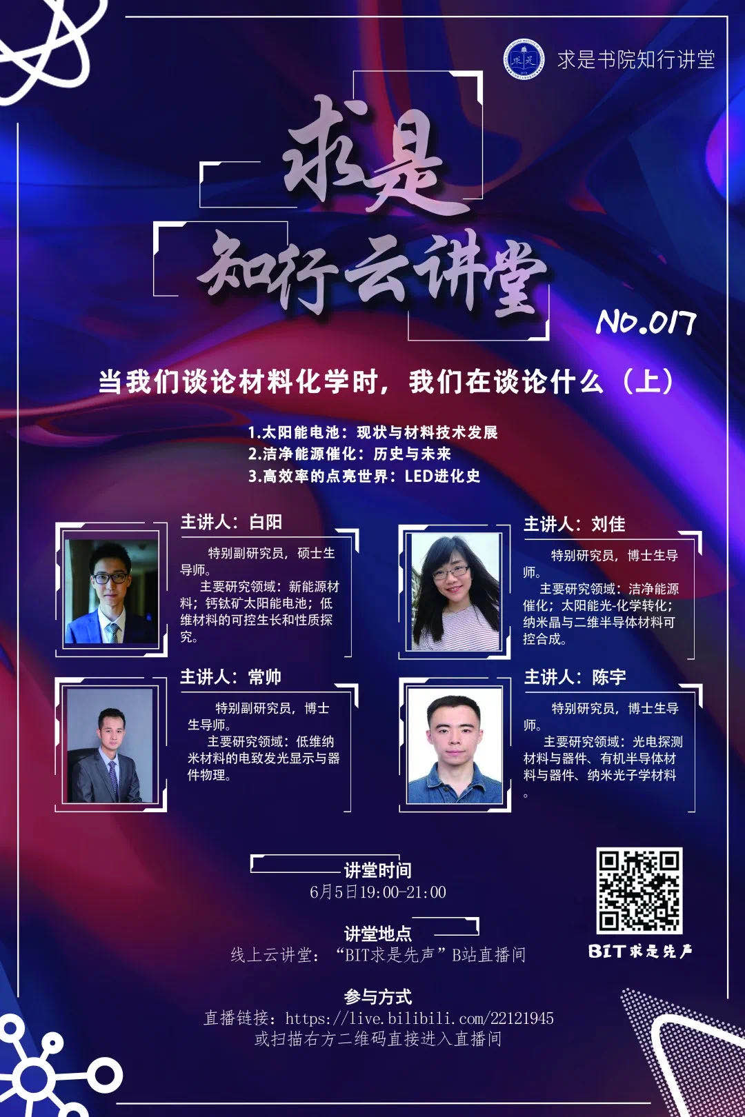 为了解答这些疑惑,6月5日,求是知行云讲堂第十七期在哔哩哔哩平台正式与大家见面了。本期知行云讲堂邀请到了材料学院材料物理与化学系的陈宇老师、刘佳老师、常帅老师和白阳老师作为主讲人,为大家讲授关于材料化学的知识,同时也向大家介绍了材料物理与化学系,让即将进行专业选择的大一新生对材料物理与化学系有了更深的了解。本次知行讲堂由求是书院与材料学院合办,材料物理与化学系承办,将分上下两期为求是书生进行材料化学的科普讲座。