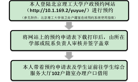 一、 户籍卡为本人重要有效证件,借用后请妥善保管,不要折叠和污损。二、 良乡校区户籍室借用户口卡的最长时限为三天,如有特殊情况,请学生提交书面情况说明,由学部或院系负责人签字盖章才可延期,反之,将未按期归还的学生不再提供预约服务。