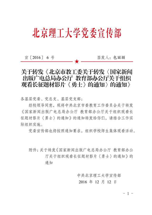 关于转发《北京市教工委关于转发〈国家新闻出版广电总局办公厅 教育部办公厅关于组织观看长征题材影片《勇士》的通知〉的通知》