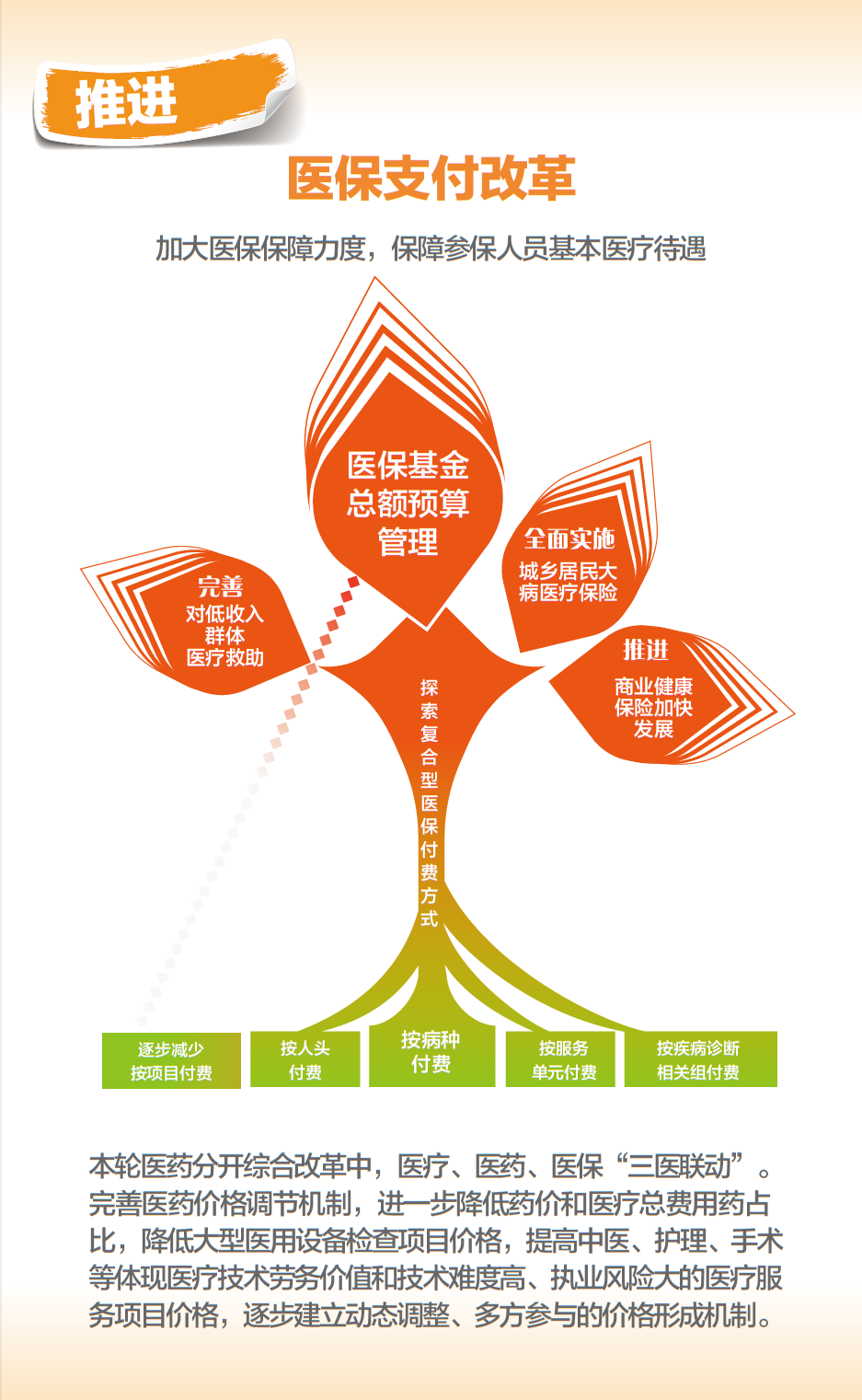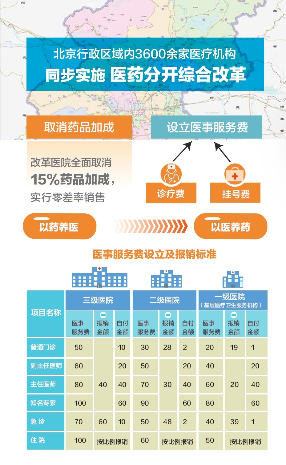 一是医药分开,可用“三取消一增设”概括。即:取消药品加成(不含中药饮片)、挂号费、诊疗费,设立医事服务费。新设医事服务费目的是体现医务人员技术劳务价值,推动分级诊疗。