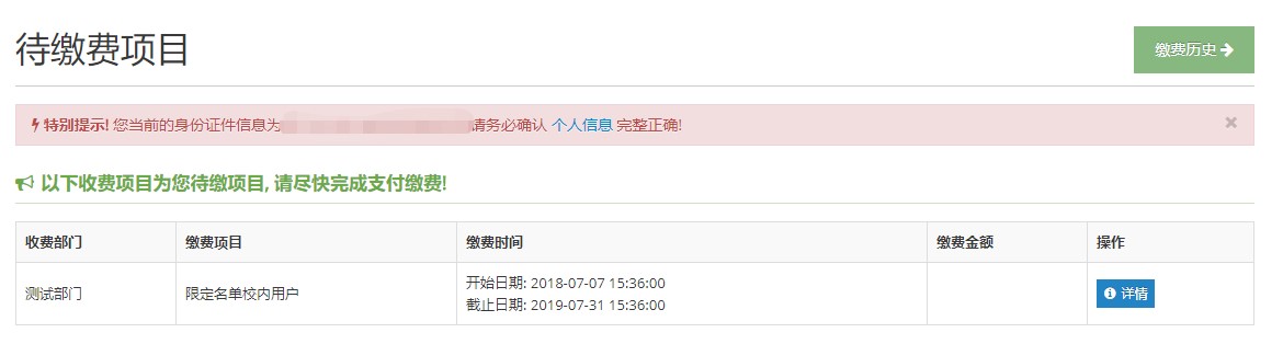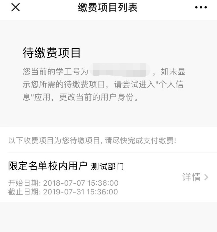 步骤二:登录后,查看待缴费项目,点击“详情”查看