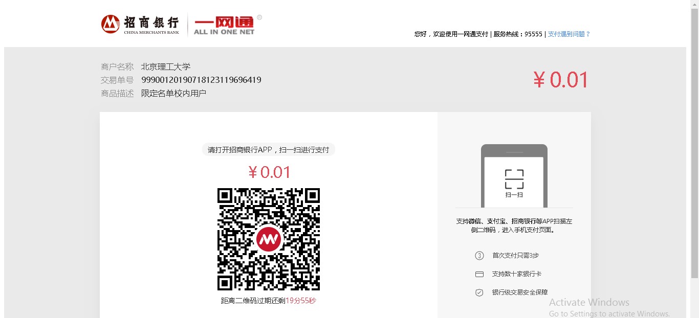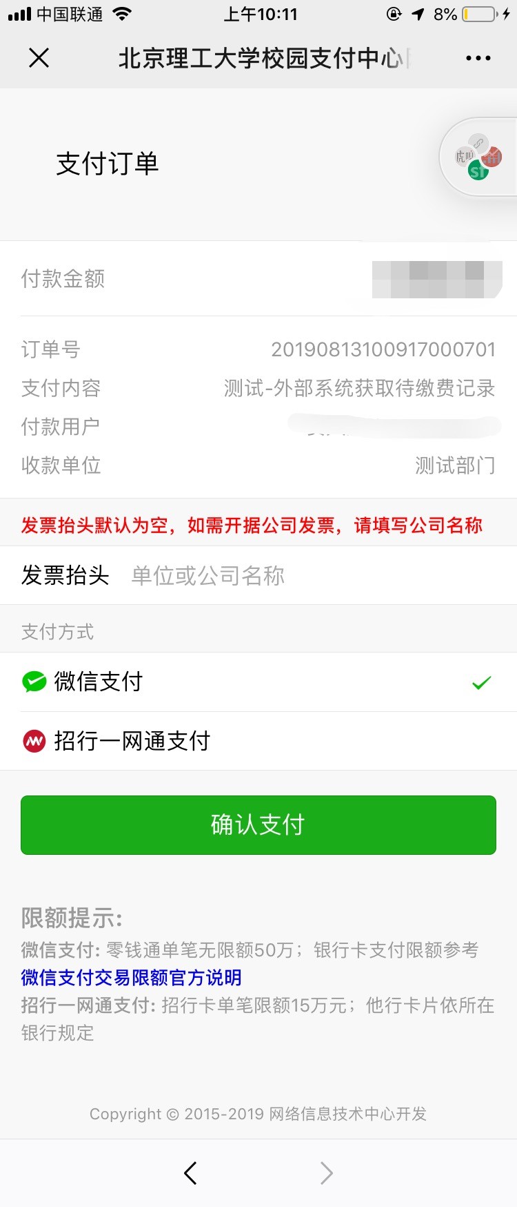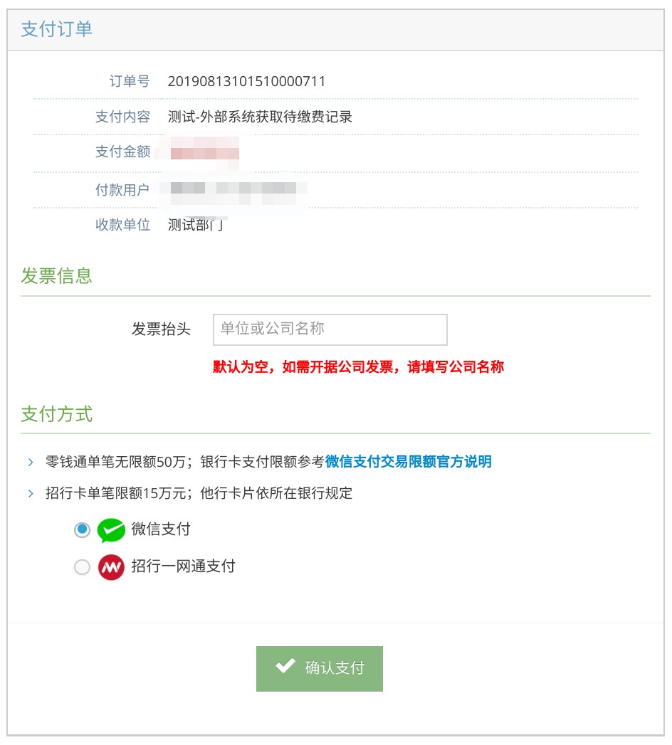 步骤四:选择支付,进入支付页面。开具发票如需在姓名后增加单位、公司名称的,可在本页填写单位、公司名称。然后点击“确认支付”,进入扫码界面。选择“微信支付”则使用微信扫码;选择“招商一网通支付”则使用招商银行APP或相应程序扫码。