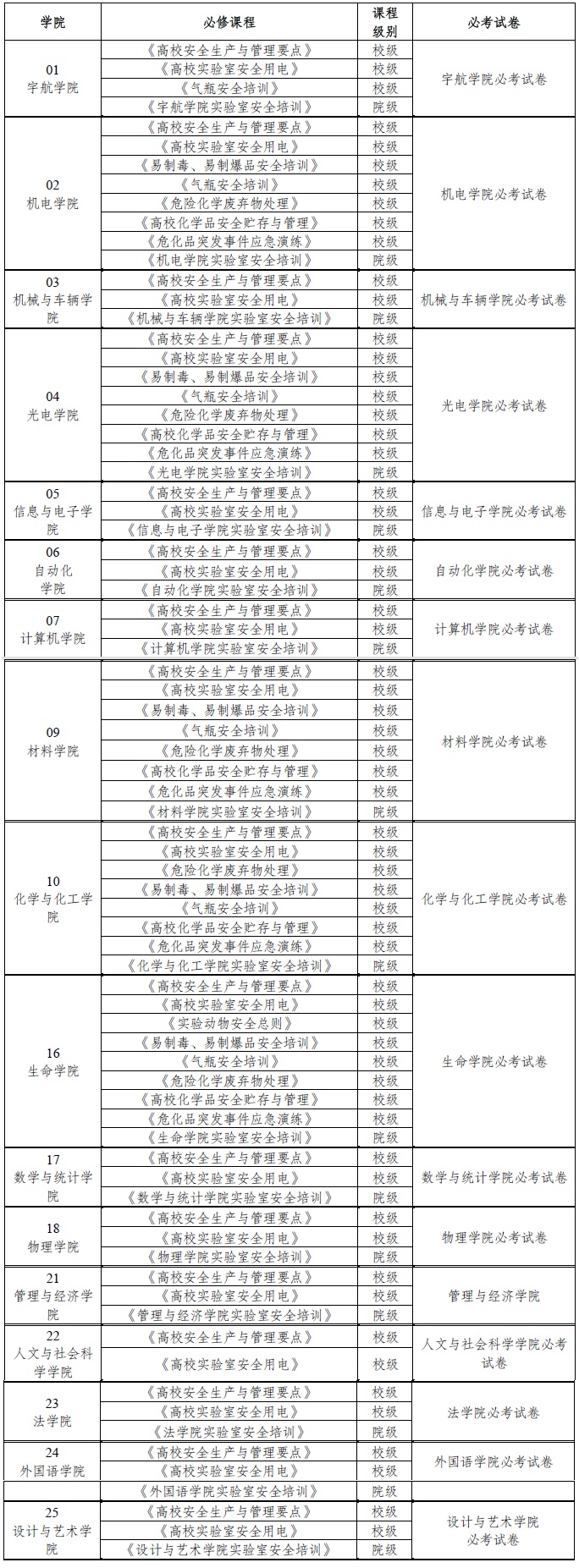 各学院校院级必修课程和必考试卷安排见表1(以下简称《安排表》)。所有参训人员须在2019年10月30日前完成校院级必修课程的学习和必考试卷的答题,考试合格线90分(满分100分),考核不合格的学员不得在实验室开展实验。