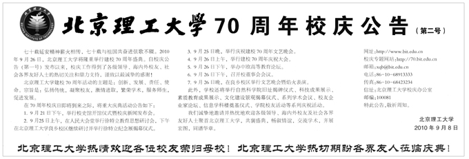 在70周年校庆日即将到来之际,将重大庆典活动公告如下: