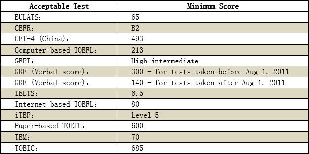 注:表格中列出的CET(China)指的是全国大学英语四级(或六级)考试。beat365教务处提供iTEP考试服务,缺少英语成绩的同学如要报名,教务处将统一组织考试。