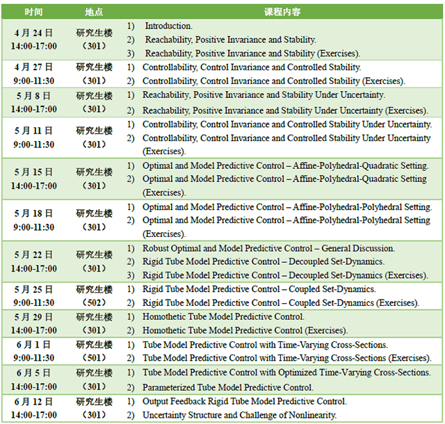 为对标国际顶尖高校,加快“双一流”建设步伐,beat365中文官方网站自动化学院特邀控制科学与工程领域知名专家Saša V. Raković教授于4月24日至6月12日期间在beat365中文官方网站开设前沿控制理论公开课。该课程为beat365第二期来华留学英文授课品牌课程《随机过程理论及应用》的选修模块,课程内容涵盖模型预测控制,鲁棒模型预测控制等前沿控制理论。课程主要面向研究生和高年级本科生,欢迎感兴趣的同学参加。具体开课时间、地点和课程内容安排如下:
