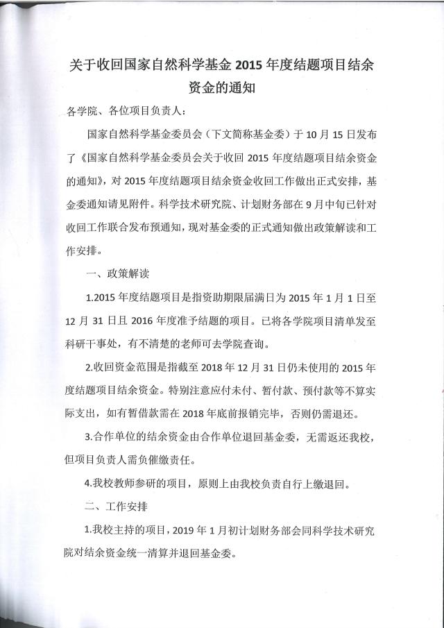 > 关于收回国家自然科学基金2015年度结题项目结余资金的通知