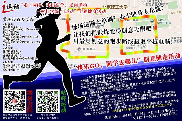 1.参与者借助移动设备上流行的锻炼辅助软件(指定软件:咕咚运动),在慢跑、长走、自行车骑行的过程中记录自己的运动轨迹,通过丰富的想象力和精心的设计,让原本单调的圆型路线变成丰富多彩的图案(如校徽、数字2014等)。要求单次快走或跑步(速度3米/秒以下)距离需不少于1公里;自行车骑行(速度3米/秒以上)距离不少于5公里。