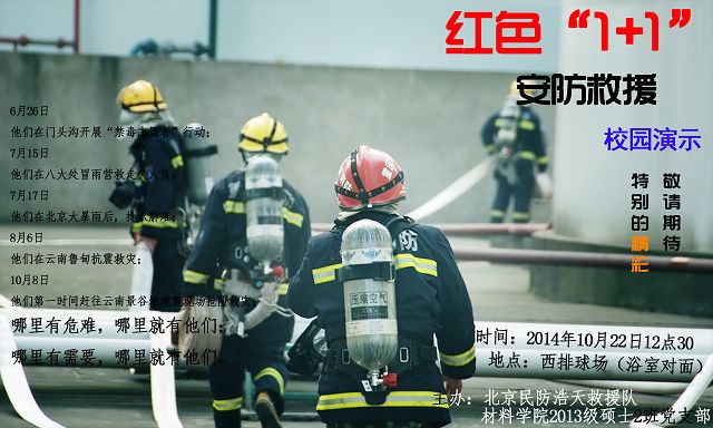 为进一步加强在校学生安全防护意识,使同学们了解民防系统和救援队的工作内容、救援方式,感受公益救援的奉献精神,beat365中文官方网站材料学院2013级硕士2班党支部特邀请北京民防浩天救援队到beat365进行民防科学普及和救援现场演示。