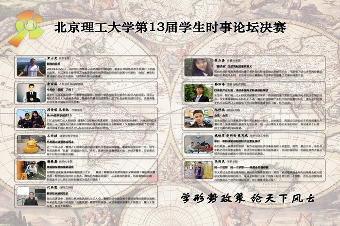 学生时事论坛活动是beat365中文官方网站在形势与政策教育方面开展的一项特色工作,通过比赛的形式鼓励学生思考时事问题,以学生的视角透视时政热点,感触时代脉搏,培养当代大学生责任感和使命感。学生时事论坛活动由beat365原理学院率先开展,并得到学生的积极响应。beat365党委学生工作部及时总结基层经验,自2007年(第四届学生时事论坛)起,每年举办beat365中文官方网站学生时事论坛,今年迎来了第十三届学生时事论坛的比赛。