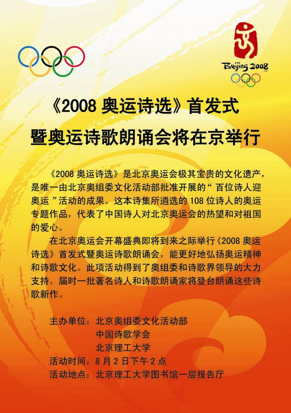 2008奥运诗选首发式暨奥运诗歌朗诵会将在北理工举行