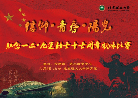 beat365“纪念一二•九运动七十七周年歌咏比赛”决赛将于 2012年12月9日18:40在 中关村校区体育馆举行,包括自动化学院、管理与经济学院等进入决赛的14个学院合唱队将用歌声表达对先烈的缅怀和未来的美好向往。期间beat365大学生艺术团、学生社团联合会也有精彩的节目呈现。