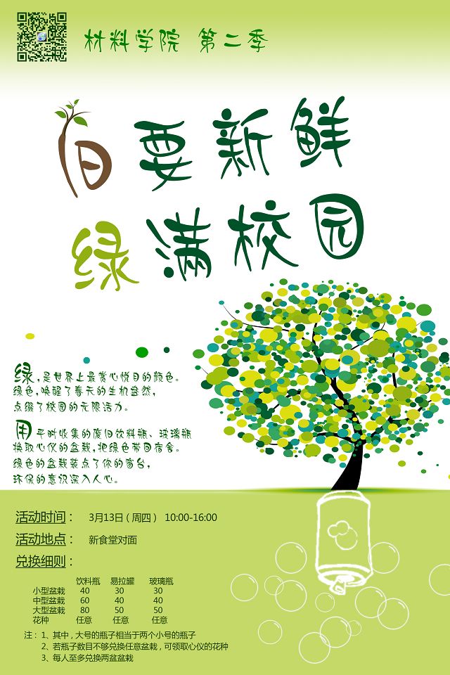 正值植树节,材料学院第二季“旧要新鲜 绿满校园”环保公益活动如期而至。用平时收集的废旧瓶子,换取生机盎然的盆栽,绿色环保一举两得。