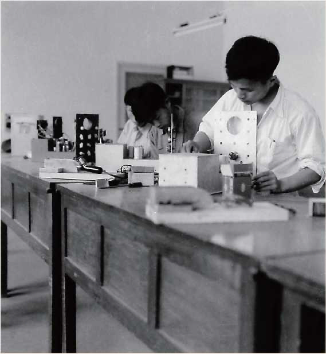▲ 1958年,为大力支持首都工业建设,无线电系 积极开展勤工俭学。这是参加勤工俭学的同学们正在安装他们试制成功的新产品阴极射线示波器,供应有关部门的需要