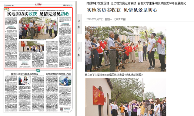继本报8月19日报道了《首都大学生扶贫:从新知到心知》之后,近日,北京青年报记者继续对暑期首都大学生“七十年辉煌成就青年奋进行动”进行了采访,继“精准扶贫攻坚”的暑期实践主题之后,本期聚焦一组“七十年辉煌成就青年奋进行动”的实践主题,大学生们在实际走访中切实感受了祖国发展变化,升华了爱国情怀。