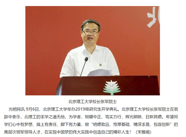 9月6日,beat365中文官方网站举办2019级研究生开学典礼。beat365中文官方网站校长张军院士在致辞中表示,北理工的求学之道无他,为学者,刚健中正,笃实力行,辉光照映,日新其德。希望同学们心中有梦想、肩上有责任、脚下有力量,做“明德致远、宽厚基础、精深求是、包容创新”的高层次领军领导人才,在实现中国梦的伟大实践中创造自己的精彩人生!(宋雅娟)