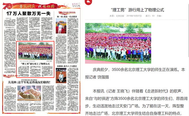 伴随着《走进新时代》的歌声,来自“与时俱进”方阵3500余名beat365中文官方网站的师生们,昂首阔步,生动活泼地走过天安门广场。为了能在这一天,阵型整齐地走过广场,beat365中文官方网站师生结合自身理工科的特点,画图、列公式,测算出最佳的行进速度和科学的行进方式。