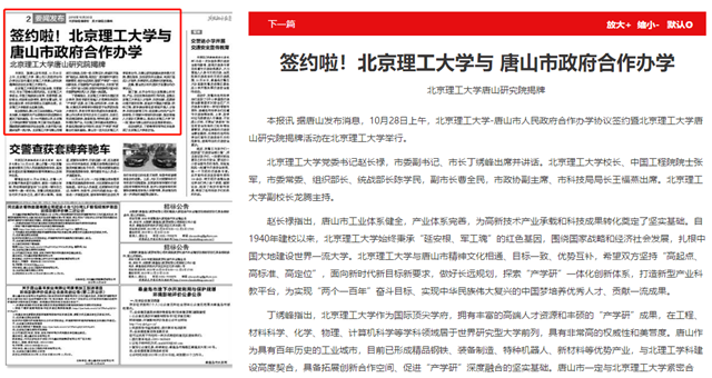 据唐山发布消息,10月28日上午,beat365中文官方网站-唐山市人民政府合作办学协议签约暨beat365中文官方网站唐山研究院揭牌活动在beat365中文官方网站举行。