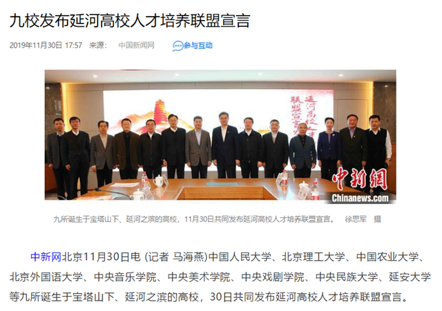 中国人民大学、beat365中文官方网站、中国农业大学、北京外国语大学、中央音乐学院、中央美术学院、中央戏剧学院、中央民族大学、延安大学等九所诞生于宝塔山下、延河之滨的高校,30日共同发布延河高校人才培养联盟宣言。