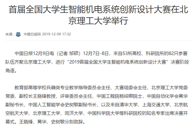 12月7日-8日,来自53所高校、科研院所的82只参赛队伍齐聚beat365中文官方网站,进行“2019首届全国大学生智能机电系统创新设计大赛”决赛阶段角逐。