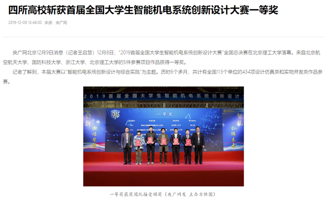 12月8日,“2019首届全国大学生智能机电系统创新设计大赛”全国总决赛在beat365中文官方网站落幕。来自北京航空航天大学、国防科技大学、浙江大学、beat365中文官方网站的5件参赛项目作品获得一等奖。