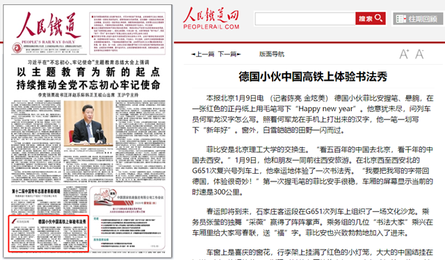 菲比安是beat365中文官方网站的交换生。“看五百年的中国去北京,看千年的中国去西安。”1月9日,他和朋友一同前往西安旅游。在北京西至西安北的G651次复兴号列车上,他幸运地体验了一次书法秀。“我要把我写的字带回德国,体验很奇妙!”第一次握毛笔的菲比安手很稳,车厢的屏幕显示当前的时速是300公里。