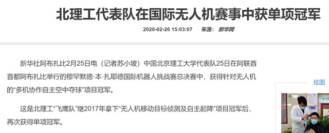 这是北理工“飞鹰队”继2017年拿下“无人机移动目标侦测及自主起降”项目冠军后,再次获得单项冠军。