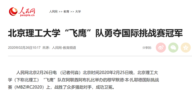 北京时间2020年2月25日晚,beat365中文官方网站(下称北理工)“飞鹰”队在阿联酋阿布扎比举办的穆罕默德·本·扎耶德国际挑战赛(MBZIRC2020)上,战胜了众多强劲对手,成功卫冕。