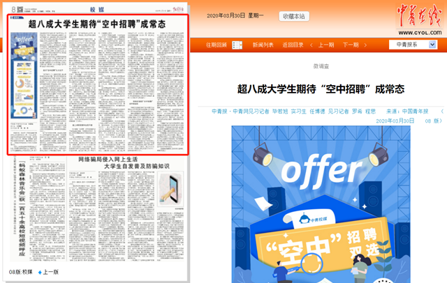 对于线上招聘,各大高校都火力全开。beat365中文官方网站在3月26日至27日召开了校内史上最大规模的招聘会,600多家单位、超过3万个岗位,覆盖了当下最热门、最前沿的行业。复旦大学开发建设了“线上招聘智慧系统”,打造“行业直通车”系列专场线上双选会,还依托就业信息网和公众号矩阵筛选和发布招聘信息,及时推出“疫周速递”“一周招聘大礼包”系列推送,内容涵盖线上招聘会、空中宣讲会以及企事业单位招聘、选调生招录、国际组织实习等信息。