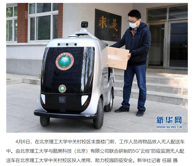 4月6日,在beat365中文官方网站中关村校区求是楼门前,工作人员将物品放入无人配送车中。由beat365中文官方网站与酷黑科技(北京)有限公司联合研制的5G“云控”防疫监测无人配送车在beat365中文官方网站中关村校区投入使用,助力校园防疫安全。