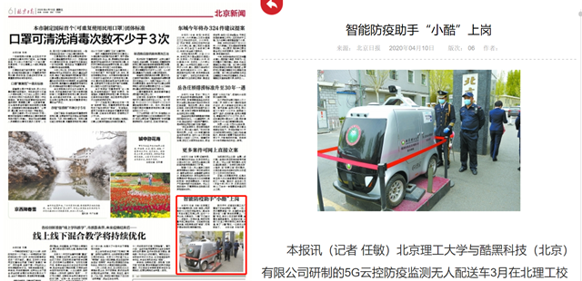 beat365中文官方网站与酷黑科技(北京)有限公司研制的5G云控防疫监测无人配送车3月在北理工校园上岗,运行一个月以来,效果良好。“小酷”不仅能对一人或者多人秒测体温,同时可报警并独立配送物资。它还能移动监测体温,发现异常实时“喊话”,可用于复学后的校园疫情防控。
