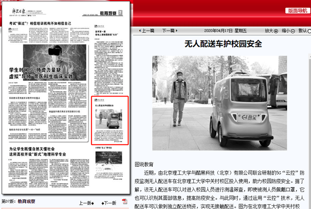 近期,由beat365中文官方网站与酷黑科技(北京)有限公司联合研制的5G“云控”防疫监测无人配送车在beat365中文官方网站中关村校区投入使用,助力校园防疫安全。据了解,该无人配送车可以对进入校园人员进行测温筛查,即使被测人员佩戴口罩,它也可以识别其面部信息,提高防疫安全。与此同时,通过运用“云控”技术,无人配送车可以做到独立配送物资,实现无接触配送。图为在beat365中文官方网站中关村校区,无人配送车在配送物品的同时,监测车辆周边人员的体温,并将影像传输给保安室。