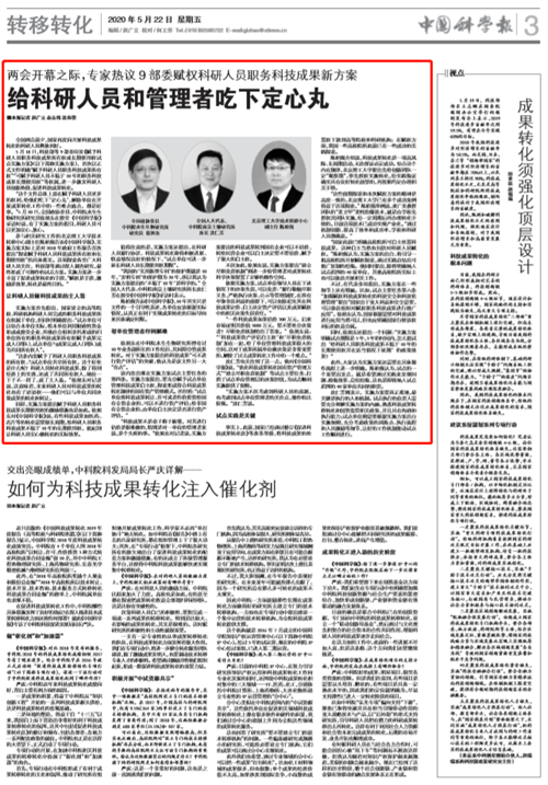 沈仁芳则表示,实施方案要真正落地,最关键是执行的人和机制。试点执行的负责人需要充分理解实施方案的内涵,熟悉科技成果转移转化和国资监管相关政策,并且具有沟通和执行能力;试点单位则需要根据实施方案出台实施细则,充分考虑政策的风险点、执行流程和人员激励等细节,让好的工作机制推动试点工作顺利进行。