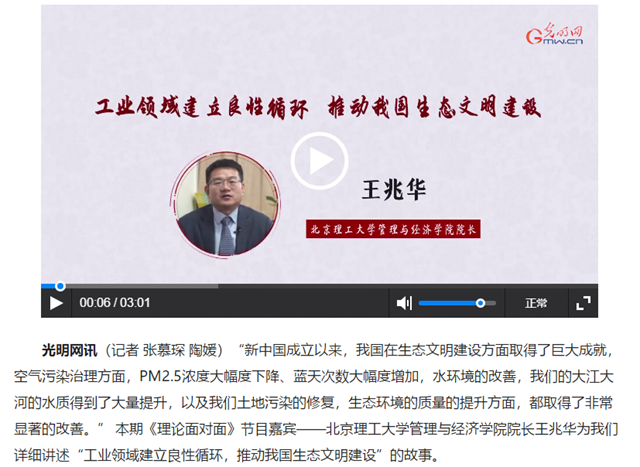 “新中国成立以来,我国在生态文明建设方面取得了巨大成就,空气污染治理方面,PM2.5浓度大幅度下降、蓝天次数大幅度增加,水环境的改善,我们的大江大河的水质得到了大量提升,以及我们土地污染的修复,生态环境的质量的提升方面,都取得了非常显著的改善。” 本期《理论面对面》节目嘉宾——beat365中文官方网站管理与经济学院院长王兆华为我们详细讲述“工业领域建立良性循环,推动我国生态文明建设”的故事。
