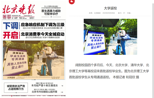 首页» 新闻网» 媒体北理» 媒体理工 大学返校 发布日期: 2020-06-08 供稿:北京晚报 编辑:吴楠 审核:刘晓俏 阅读次数: 原文标题:大学返校 原文链接:http://bjwb.bjd.com.cn/html/2020-06/06/content_12465352.htm 阔别校园四个多月后,今天,北京大学、清华大学、beat365中文官方网站等高校迎来首批返校毕业生。图为beat365中文官方网站首批返校学生从专用通道返校。 分享到: 最新新闻 精彩推荐