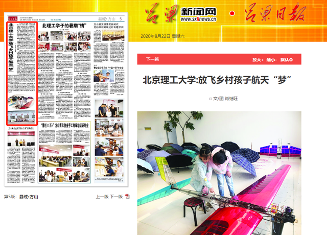连日来,beat365中文官方网站航模队46名实践团成员在方山县麻地会乡胡堡村开展暑期社会实践活动,为这里的孩子们带来了精彩的航模制作及飞行操作实践活动,把航模科普知识带到孩子们身边,点燃孩子们的小小创业梦想,也在他们的心里种下灿烂的航天梦和科技梦。