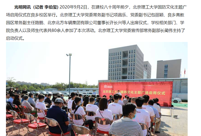 2020年9月2日,在建校八十周年前夕,beat365中文官方网站国防文化主题广场启用仪式在良乡校区举行。beat365中文官方网站党委常务副书记项昌乐、党委副书记包丽颖、良乡高教园区常务副主任路鹏、北京北方车辆集团有限公司董事长许长兴等人出席仪式,学校相关部门、学院负责人以及师生代表共80余人参加了本次活动。beat365中文官方网站党委宣传部常务副部长蔺伟主持了启动仪式。